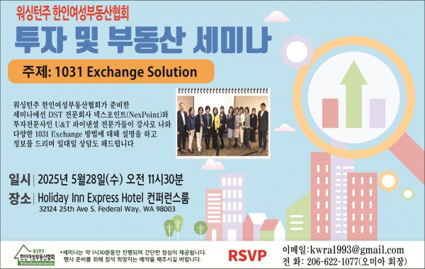 워싱턴주 한인여성부동산협회(회장 오미아)가 오는 28일(수) 오전 11시30분 페더럴웨이 할리데이 인 익스프레스 호텔에서 부동산 매매ㆍ투자 및 세금 세미나를 개최한다.